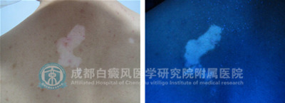 1、伍德灯检查:背部黑色素缺失严重,白斑明显,边缘模糊